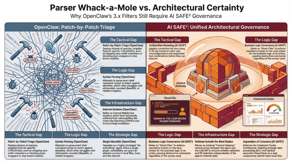 The Difference: OpenClaw has now patched WebSocket hijacking vulnerabilities in 2.25, 3.1–3.7, and 3.13. Three release cycles addressing the same attack class. Each fix is correct. Each fix arrived after the vulnerability was exploitable. AI SAFE²’s Gateway does not depend on OpenClaw’s internal WebSocket implementation being correct—it enforces policy at a position the attacker cannot reach from inside the agent. If governance is not enforced at runtime, it is not governance. It is forensics.